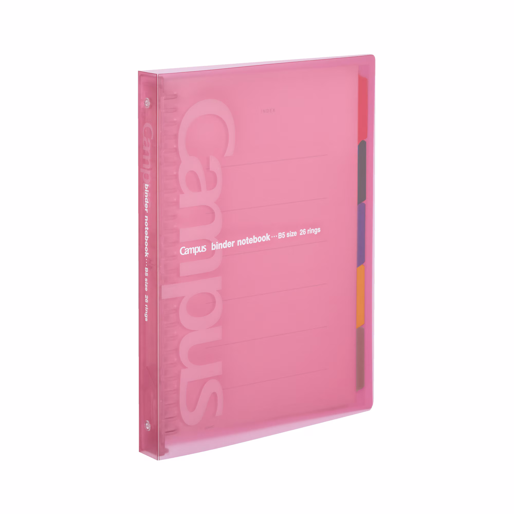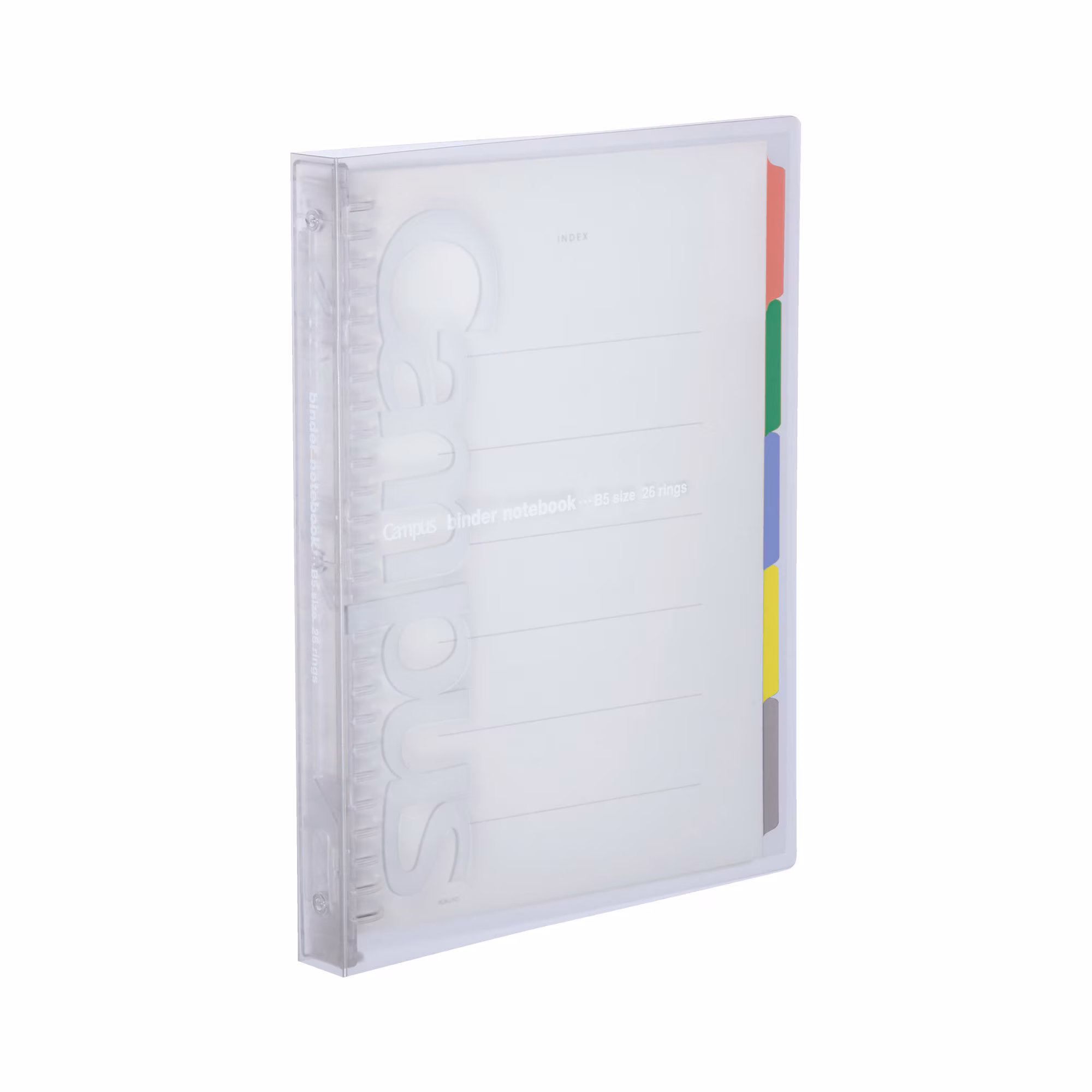 Campus slide binder opens/closes with a gentle touch. Binder holds up to 65 sheets of paper and comes with 10 sheets included. Binder contains 5 colorful tabs for dividing material into sections and a clear pocket for storage. Made in Japan.